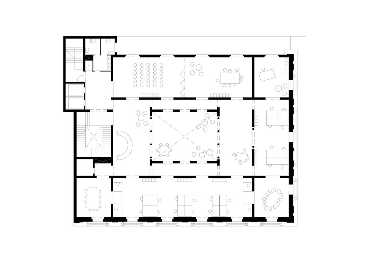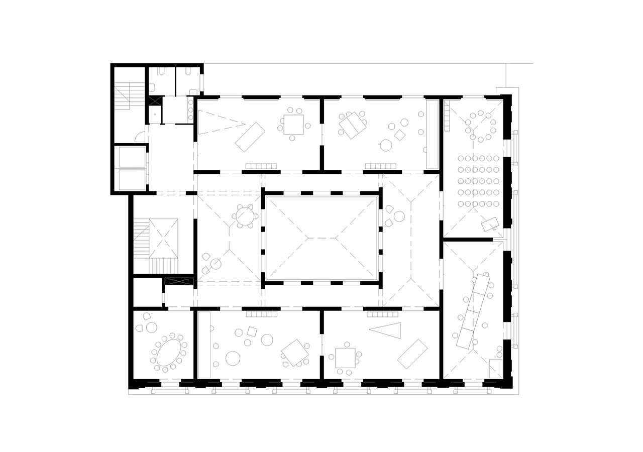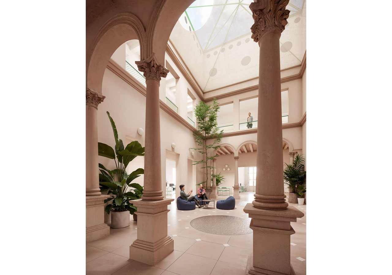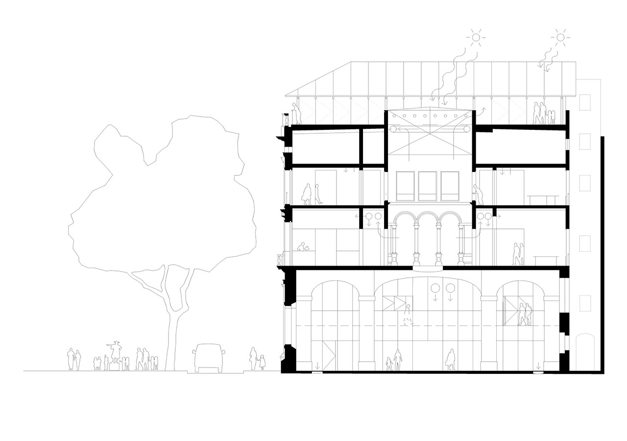 Following the sequence of the building's main levels, the transformation preserves the independence of the upper floors from the great hall, clearly separating the two types of use. The skylight in the central courtyard is replaced with a climatic device located on the second floor, transforming the courtyard into a large indoor atrium. The project partially removes the ironwork on the third floor, which dignifies the central spaces of the level occupied by classrooms and workshops.