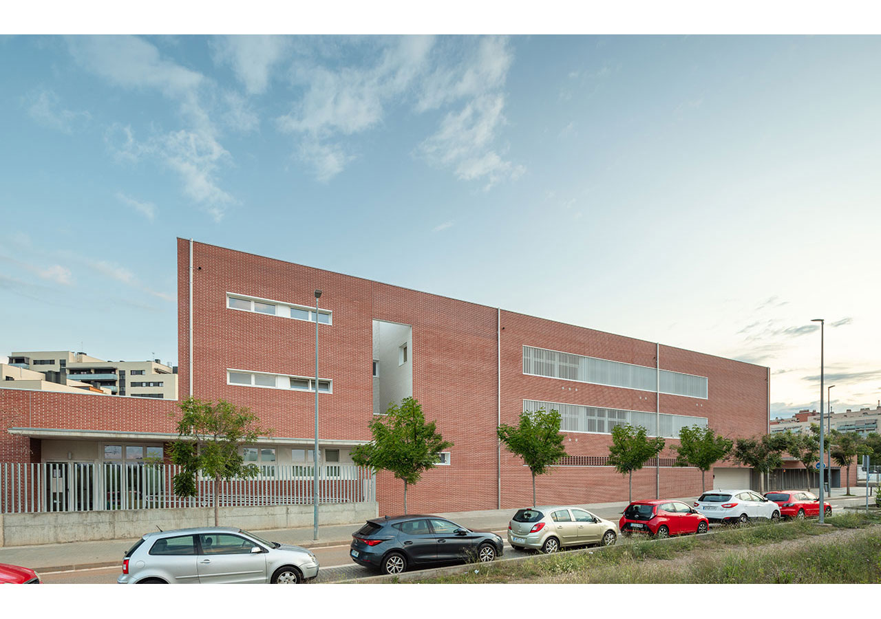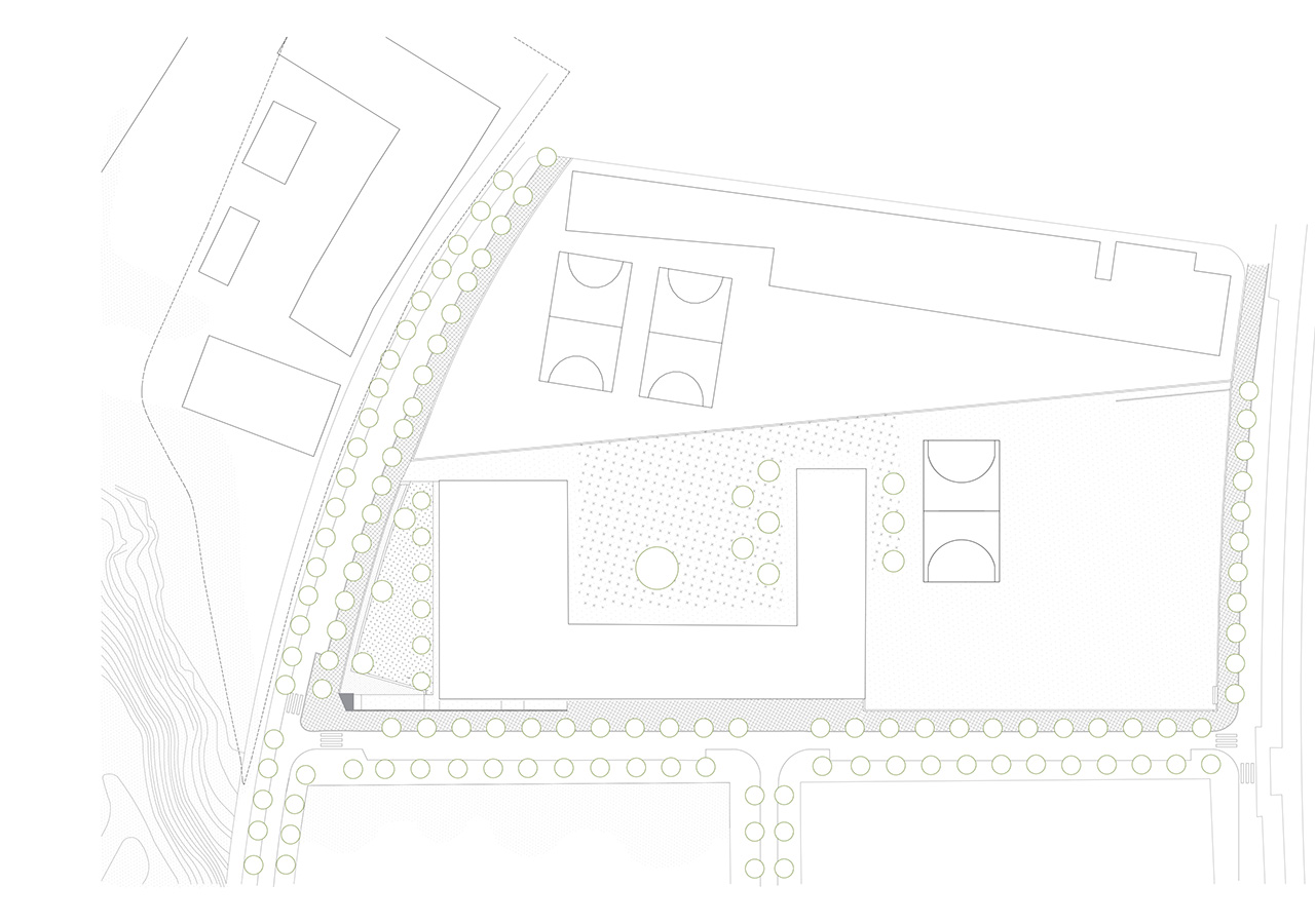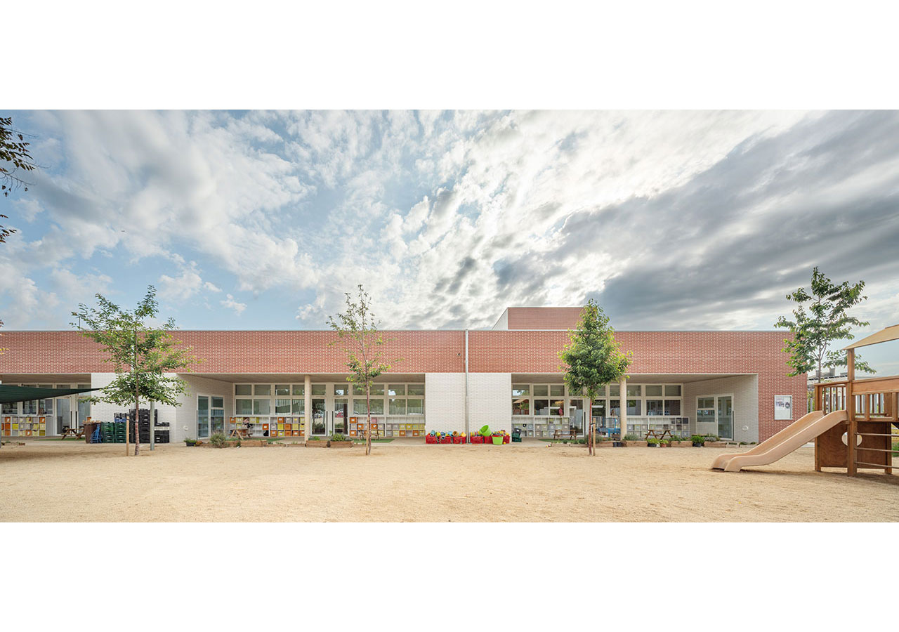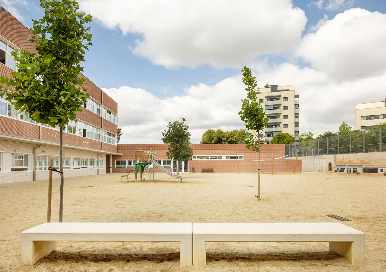 La proximitat del curs natural d’aigua del Torrent de Can Feu genera àmbits verds que el projecte replica disposant l’edifici al centre de la parcel·la i en forma de U, permetent generar 3 espais oberts que endrecen els usos: un pati central per ús de primària amb el gran pi com a protagonista, un pati a sudoest per a ús infantili amb vistes al torrent, i un pati a sud-est que s’obre cap al parc d’Odessa i on es situa la pista esportiva. Tots tres en diàleg amb la pauta verda marcada pel torrent i la seva arbreda.