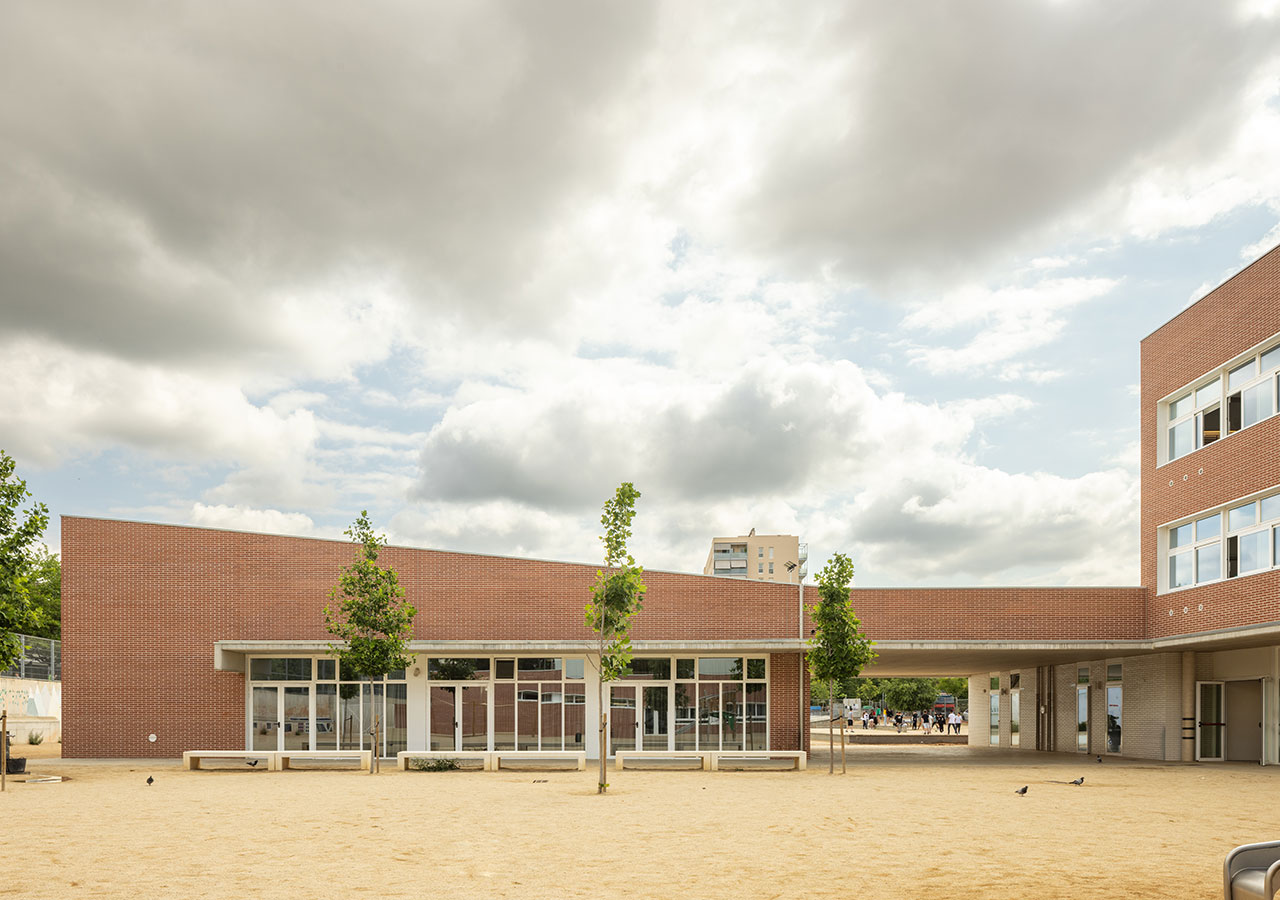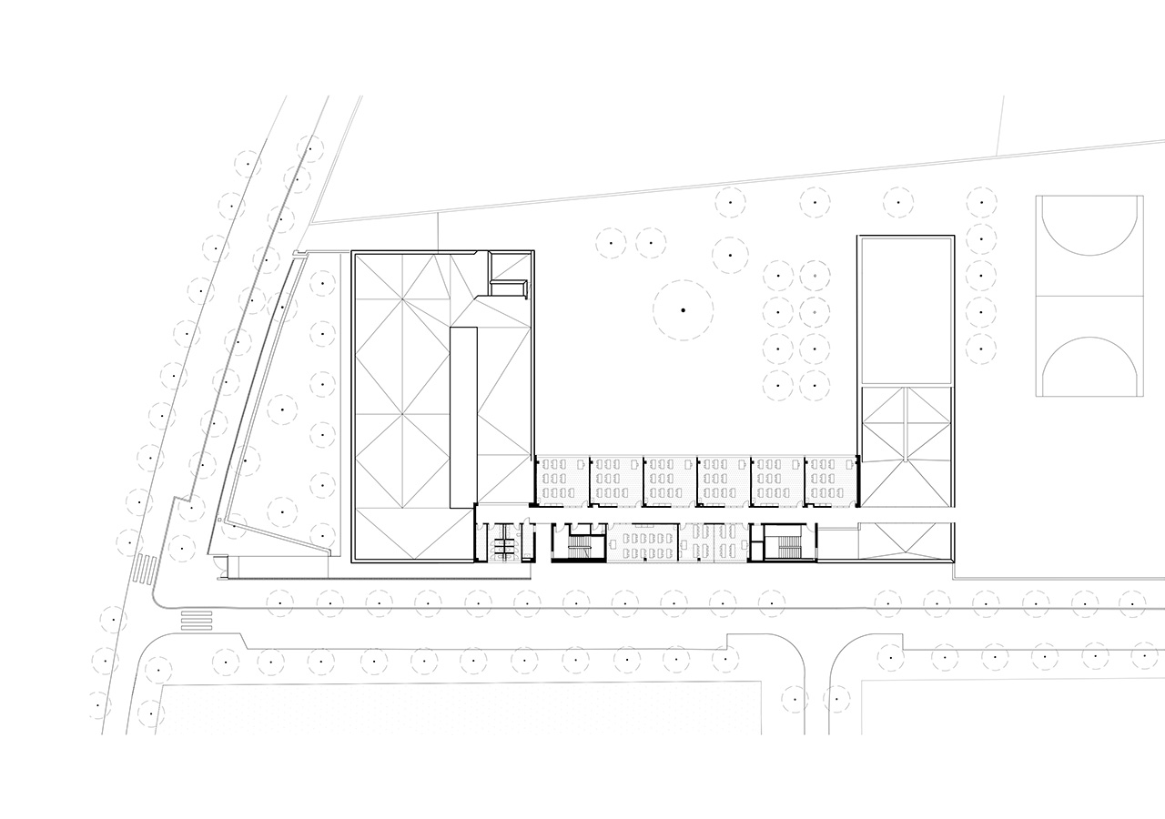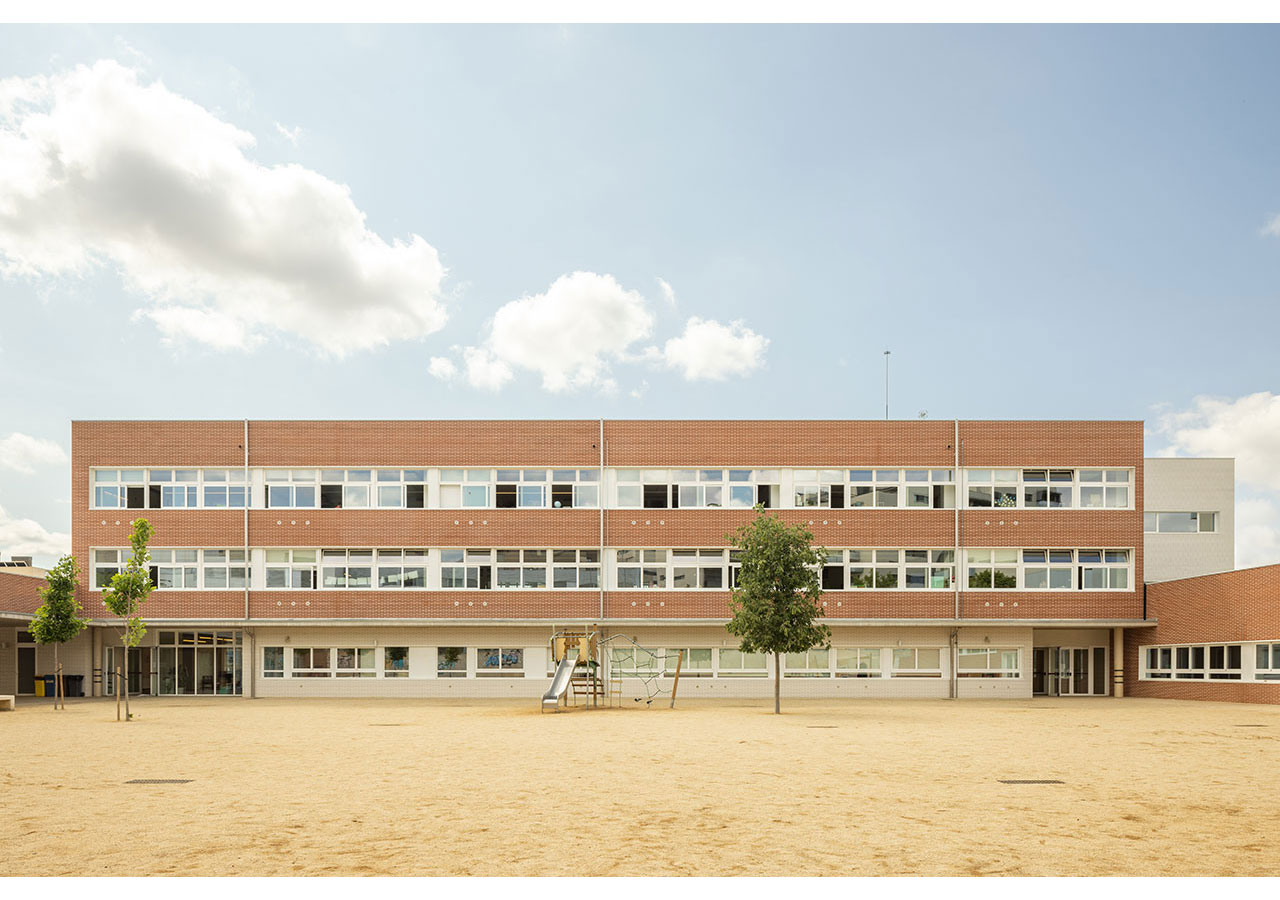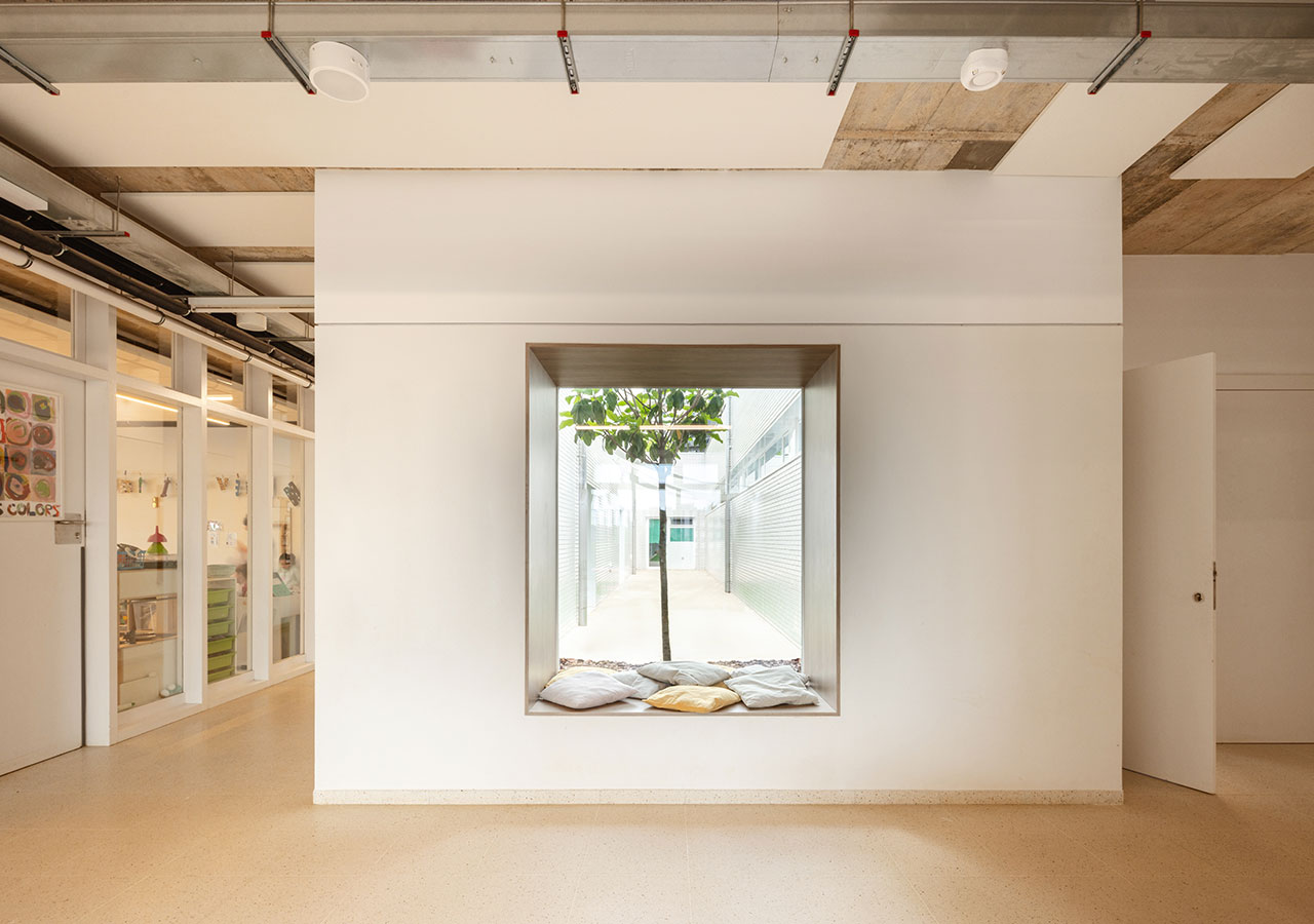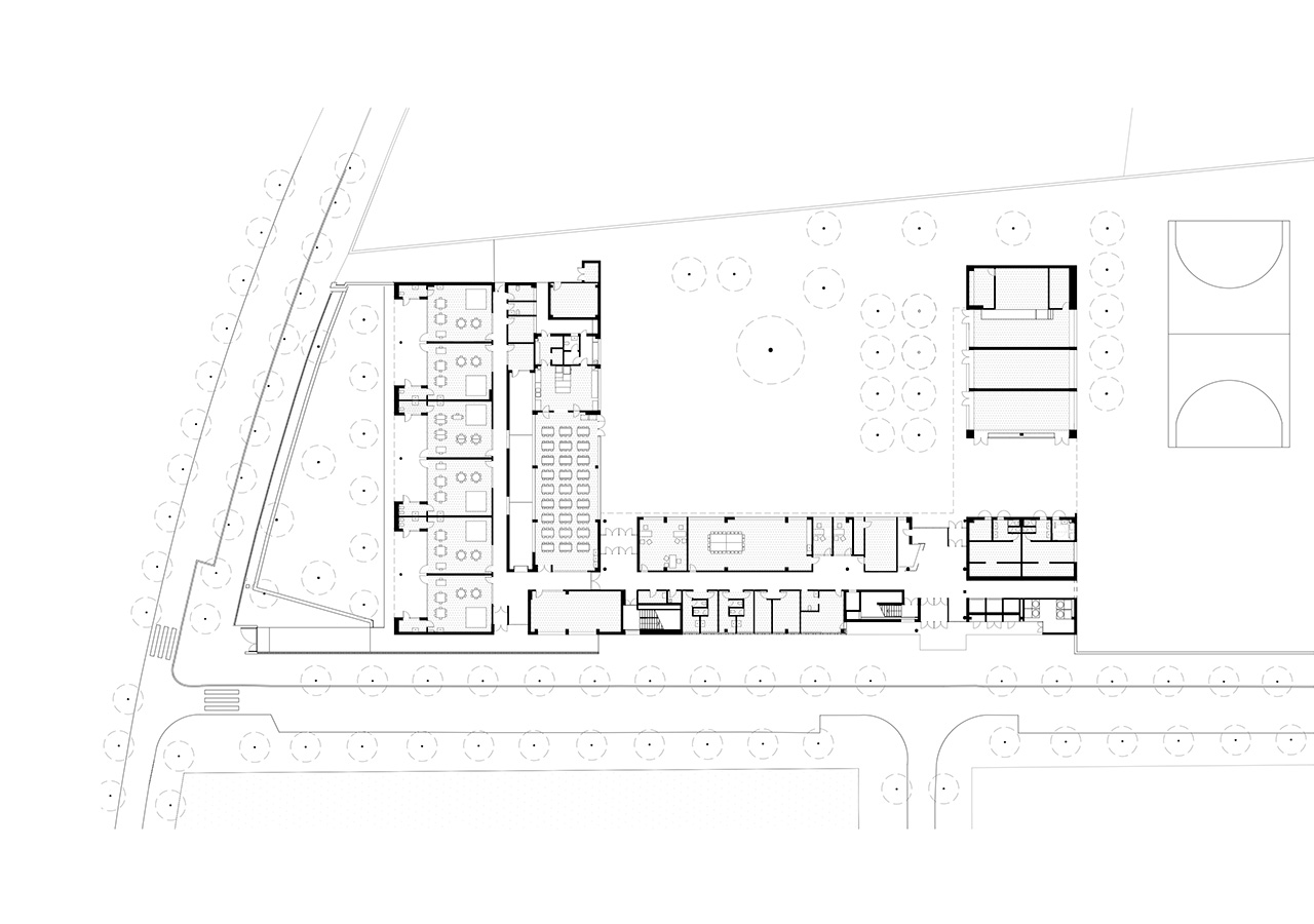 La proximitat del curs natural d’aigua del Torrent de Can Feu genera àmbits verds que el projecte replica disposant l’edifici al centre de la parcel·la i en forma de U, permetent generar 3 espais oberts que endrecen els usos: un pati central per ús de primària amb el gran pi com a protagonista, un pati a sudoest per a ús infantili amb vistes al torrent, i un pati a sud-est que s’obre cap al parc d’Odessa i on es situa la pista esportiva. Tots tres en diàleg amb la pauta verda marcada pel torrent i la seva arbreda.