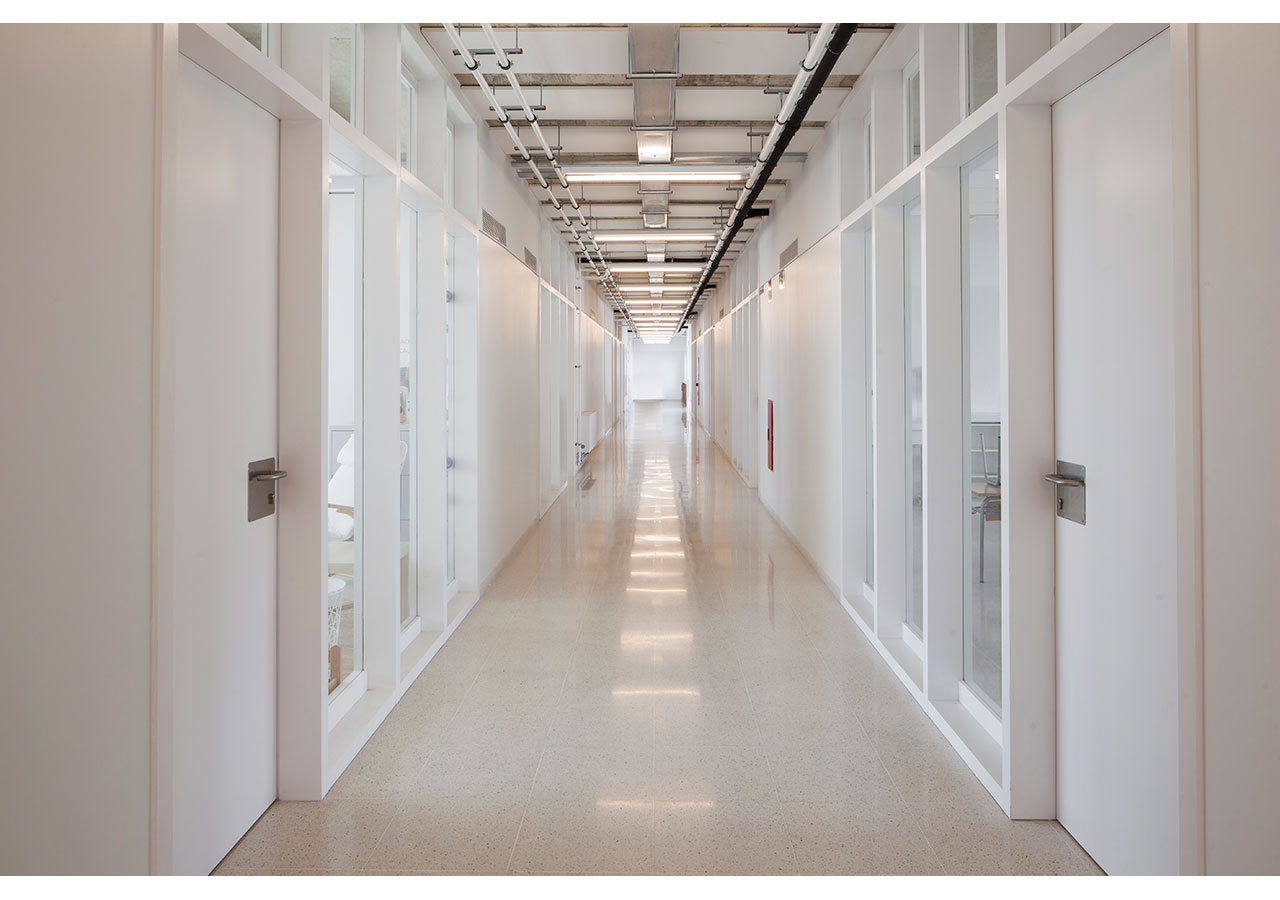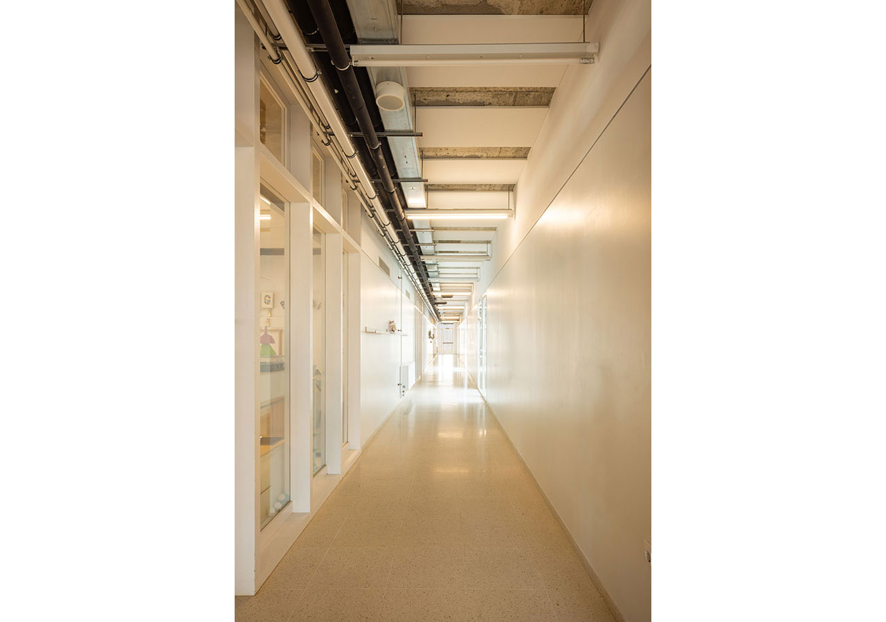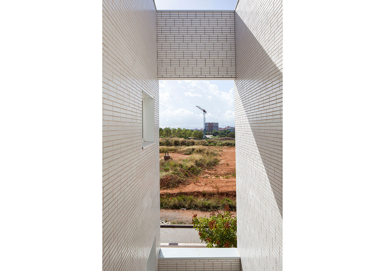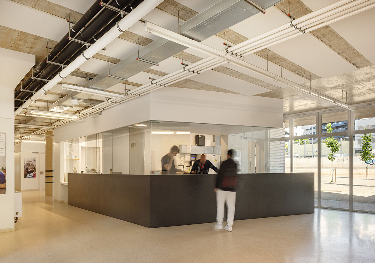 La proximitat del curs natural d’aigua del Torrent de Can Feu genera àmbits verds que el projecte replica disposant l’edifici al centre de la parcel·la i en forma de U, permetent generar 3 espais oberts que endrecen els usos: un pati central per ús de primària amb el gran pi com a protagonista, un pati a sudoest per a ús infantili amb vistes al torrent, i un pati a sud-est que s’obre cap al parc d’Odessa i on es situa la pista esportiva. Tots tres en diàleg amb la pauta verda marcada pel torrent i la seva arbreda.